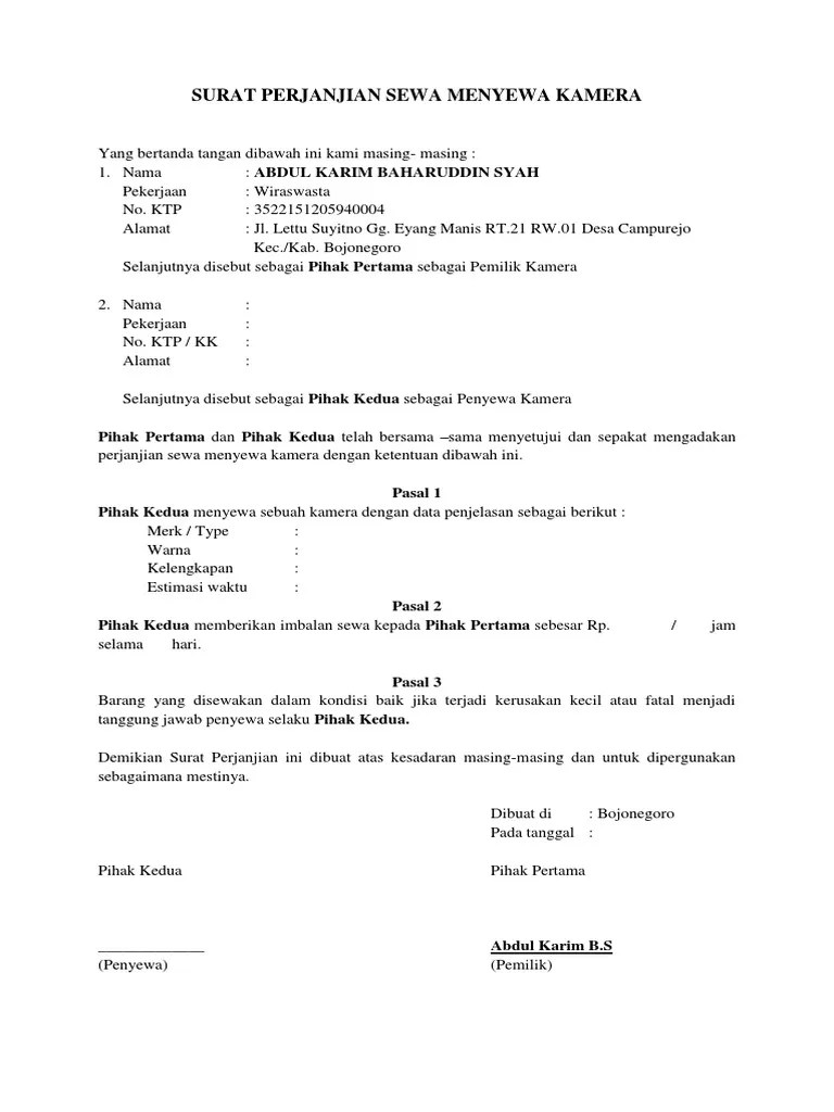 Surat perjanjian sewa menyewa kamera digital yang bertanda tangan dibawah ini: